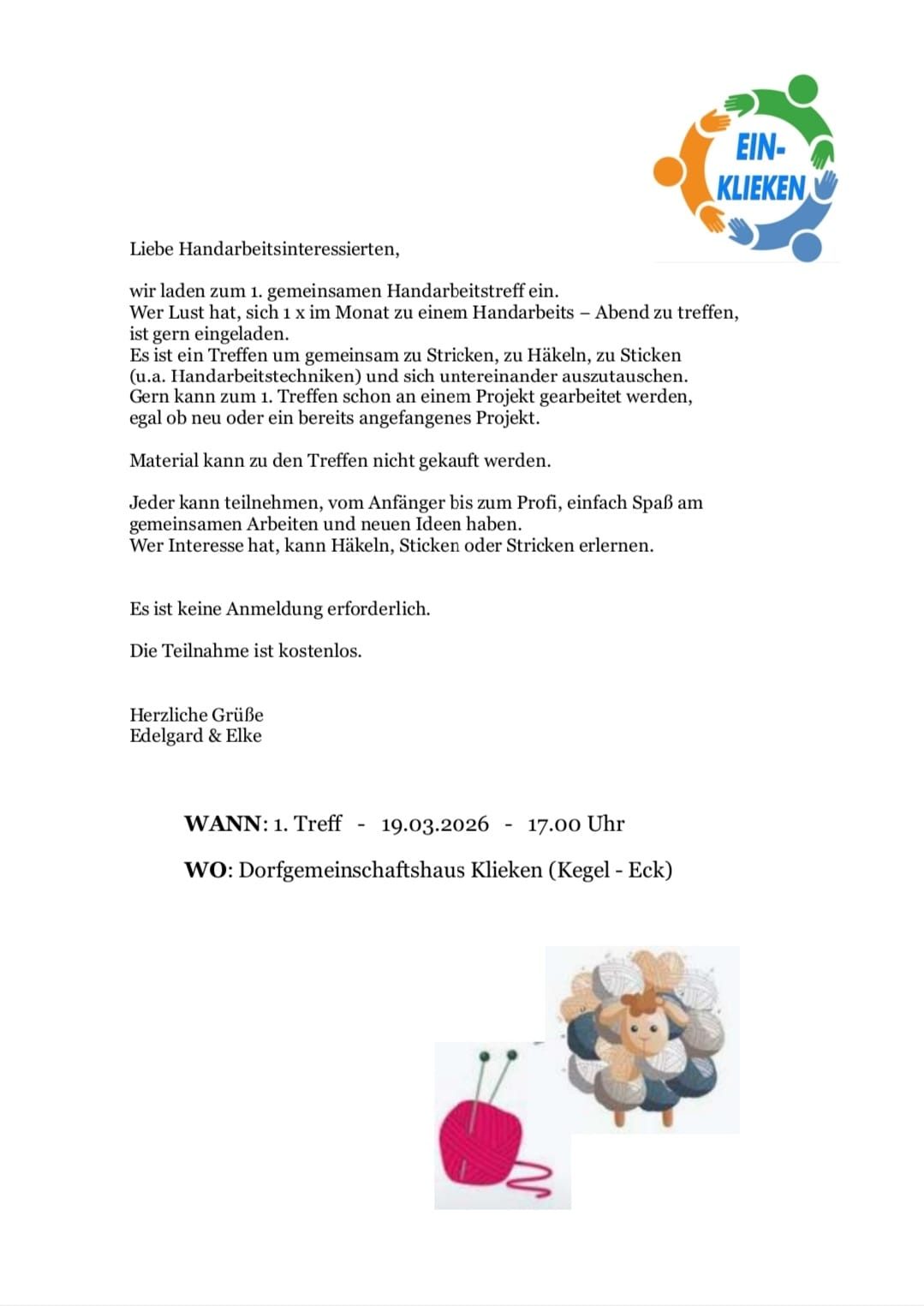 Wir laden herzlich zum 1. Handarbeitstreffen ein. Wer hat Interesse am Häkeln, Stricken oder Sticken? Einfach vorbeikommen.